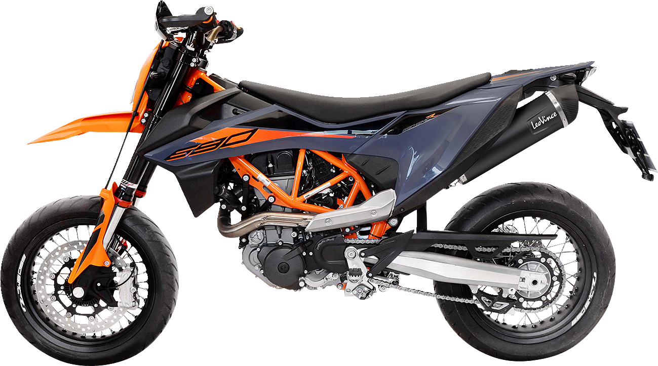 Features a stainless steel muffler sleeve with a unique metallic black paint applied using ceramic engineering techniques to create a highly temperature-resistant finish Mount brackets and muffler flanges are AISI 304 stainless steel that is TIG-welded for strength Exhaust end cap is carbon fiber with an asymmetrical, aggressive slash-cut design Leo Vince logo is laser-etched on the muffler Meets EVO II homologation requirements Mufflers come with a dB killer insert installed; insert is removable