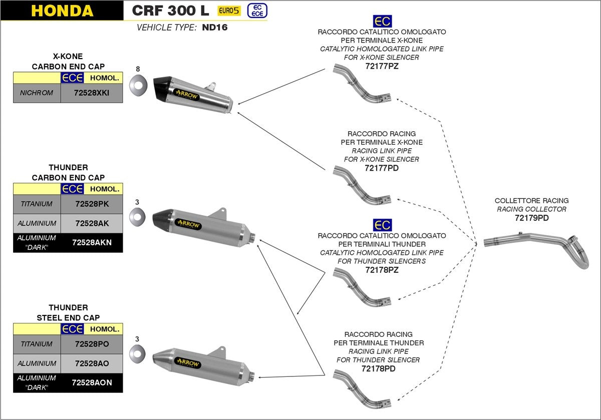 Years spent working hard with top-level race team all over the World made it possible to design an exhaust range, named Off-Road Thunder, with all the features of lightness, durability and performance that are the basic qualities of any Arrow exhausts. Diamond-shaped section, sort of trademark for Arrow, ensure a perfect balance between internal volume and external dimensions: the silencer endcaps are designed to create a perfect mix with the silencer shape, following the requirements stated in race rules.