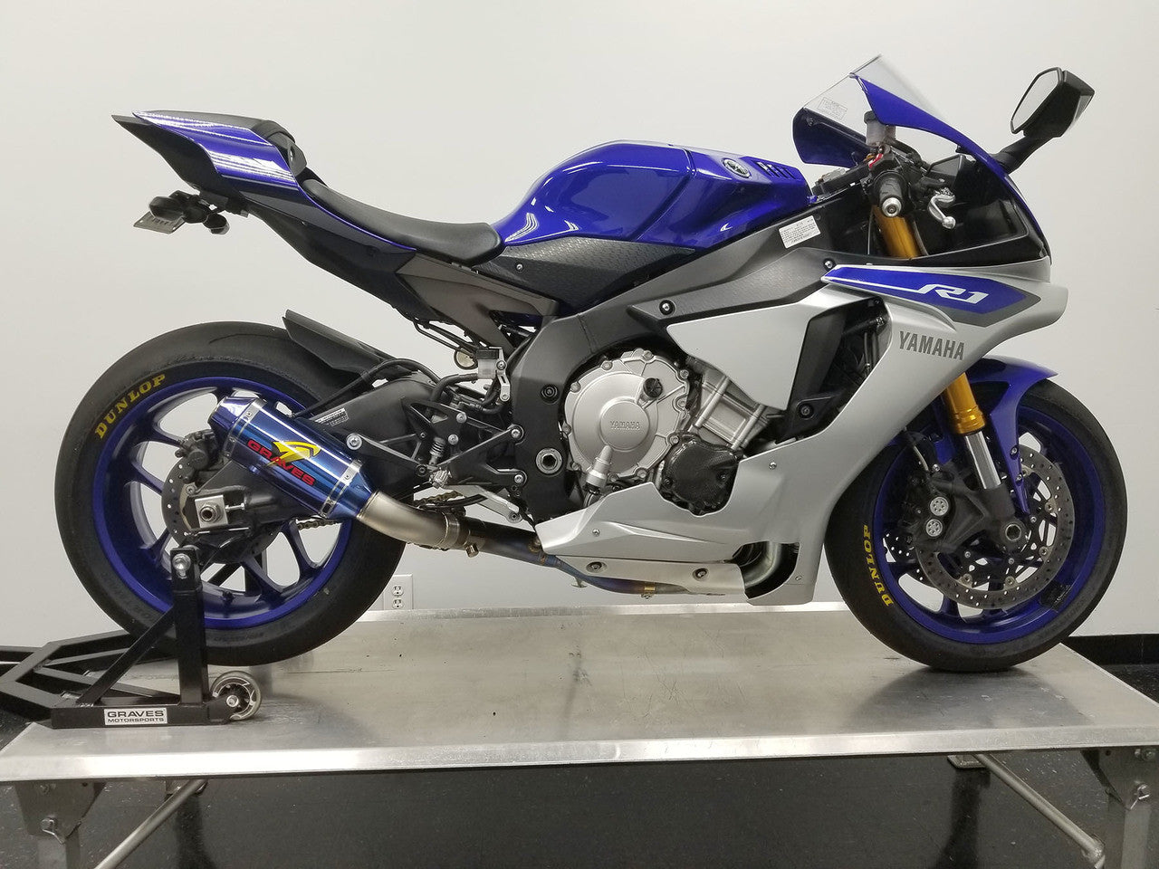 Graves Motorsports Titanium ElectricK bLUE Yamaha R1 Cat Eliminator Exhaust with (Exhaust Valve Type-R – Butterfly Valve Technology). Requires FTEcu software purchased separately to use the EVR map (Verified purchases can contact sales@gravesport.com to request a map). Graves' precise engineering develops precision products that are designed to outlook, outperform and outlast the competition. Graves Exhaust systems are designed for the elite rider seeking top of the line performance, fit, finish and value. This exhaust system was developed using the same technology that has powered the Graves Racing Team to 23 Professional AMA National Championships including 8 Superbike Championship titles and 3 Side x Side Pro Titles (Pro Stock and Pro Mod UTV). Scroll down for sound and installation videos.