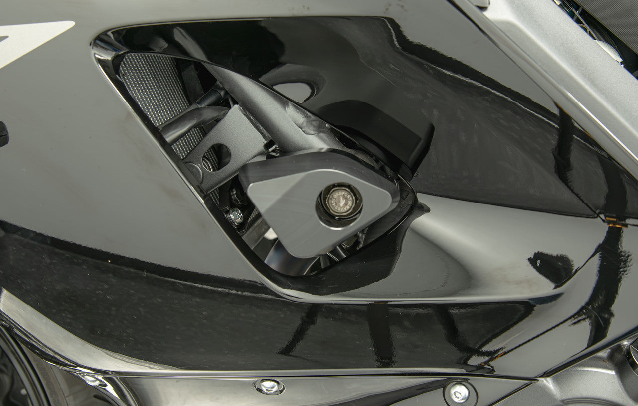 Graves Motorsports Yamaha R7 2021+ Frame Slider Kit. Graves Frame slider kits are engineered on the race track and have precise fitment. The unique diamond shape design of these sliders make for a sleek and innovative profile that keeps the protection of your motorcycle the #1 priority. Compare these with other brands' features or pricing and the clear winner is the Graves Motorsports. Precision CNC machined from 6061 T6 billet aluminum and black anodized. The 3D cad brackets deliver precise fitment and unequal Graves Race Team development and testing.